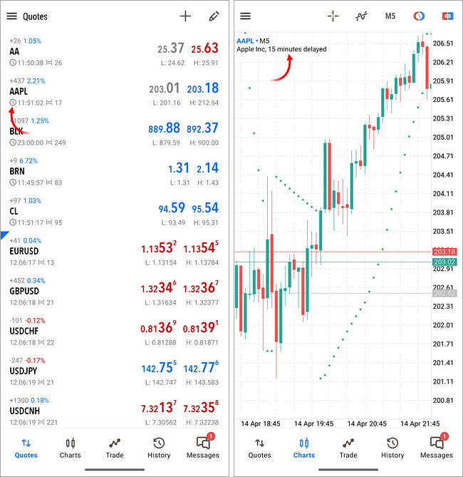 Some brokers may provide access to certain market data only through a paid subscription, which can be purchased via the desktop version of the platform. Without a subscription, data may be delivered with a delay, offered as trial access so you can test your strategies in advance. In some cases, a delay in quotes may also be a requirement set by certain exchanges that provide the data.