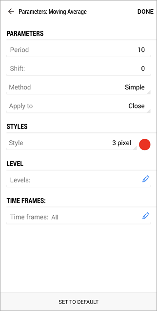Hiding Indicators #To quickly view a "clean" chart without deleting the previously added indicators, tap Also, in indicator settings, you can additionally specify the timeframes on which the indicators will be displayed. |