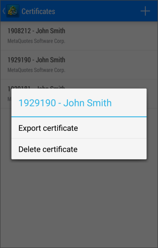Certificate Export #The previously installed certificate can be exported to a file. This will allow using it on other devices or the desktop version of the trading platform. Move to "Accounts" section. Long tap on the certificate to open its context menu. Then tap "Export certificate" and enter the password used to protect the certificate during installation. |