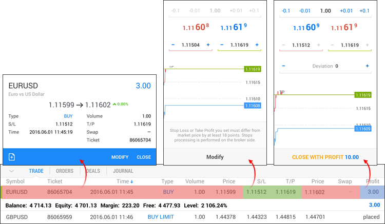 The position line is divided into several areas, tapping on which allows you to view information about it, to change or to close it: