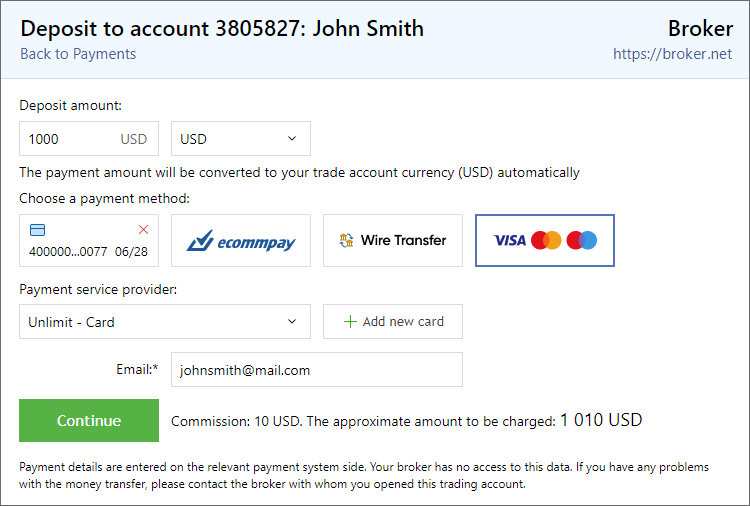 Select your preferred payment method: card, e-wallet, bank transfer, or another option. Each payment method may be supported by multiple payment systems which are provided by companies authorized by your broker. Choose the relevant provider in the "Payment service provider" field. The availability of payment methods and providers is entirely dependent on your broker.