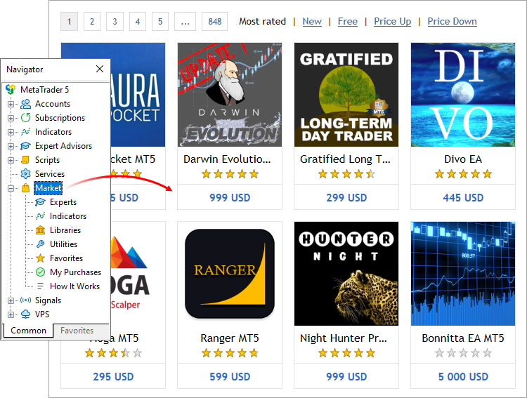 Le Market propose des milliers de produits pour la plateforme de trading : des robots de trading, des indicateurs techniques et des utilitaires utiles. Cette section vous aidera à choisir et à acheter l'application dont vous avez besoin parmi la grande variété de produits disponibles.