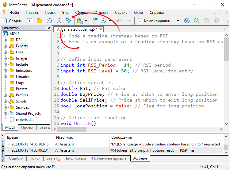 В MetaEditor доступен AI Assistant — продвинутый инструмент для автоматического дополнения кода, работающий на основе моделей искусственного интеллекта OpenAI. Вы формулируете торговую идею обычным языком, а AI Assistant предлагает ее реализацию на MQL5. Такая возможность будет полезна всем:
