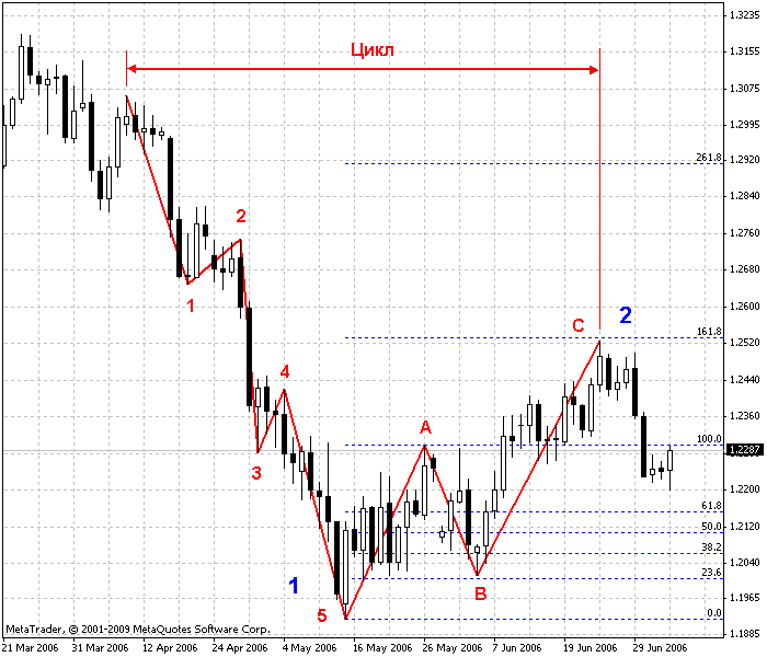 Самый длинный цикл согласно теории Эллиотта называется Большим Суперциклом, который состоит из 8 волн суперцикла, эти волны в свою очередь тоже состоят из 8 волн меньшего цикла и т.д. Например, на рис.2 изображены 3 основных цикла. Можно заметить пропорциональность волн импульса и следующих за ними волн коррекции. Чем сильнее волна импульса, тем сильнее волна коррекции, и наоборот.
