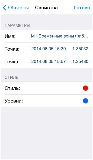 УправлениеНа линии единичного интервала расположено три точки, которые можно перемещать. С помощью первой и последних точек можно регулировать длину и направление линии. С помощью средней точки (точка перемещения) можно перемещать данный объект, не изменяя его размеров. ПараметрыВременные зоны Фибоначчи обладают следующими параметрами: