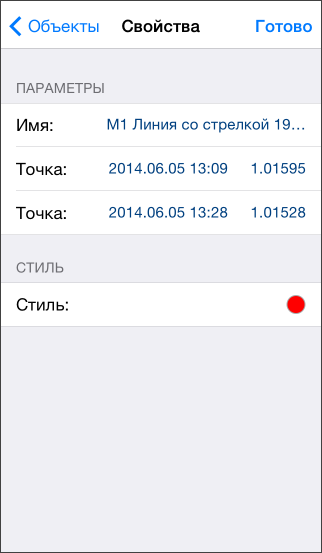 Линия со стрелкойДанный объект представляет собой прямую линию со стрелкой на одном ее конце. Он предназначен для построения пояснительных схем на графиках. ПостроениеДля нанесения линии со стрелкой необходимо выбрать данный объект, а затем коснуться графика и провести линию в необходимом направлении. При этом рядом с конечной точкой будут показываться вспомогательные параметры: расстояние по оси времени от начальной точки, расстояние по оси цен от начальной точки, угол наклона от горизонтальной линии проведенной через начальную точку. |