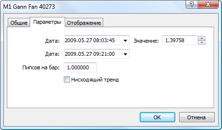 Управление Веером Ганна происходит с помощью двух точек, расположенных на линии тренда 1х1, которые можно перемещать с помощью мыши. С помощью данных точек следует расположить линию тренда веера Ганна на графике. Угол наклона линии может быть отрегулирован с помощью параметра "Пипсов на бар" , описанного ниже.
