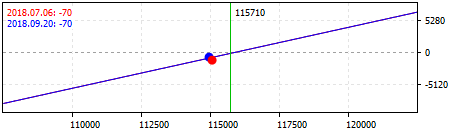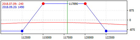 Дополнительно вы можете посмотреть график прибыли/убытка для выбранного портфеля в зависимости от итоговой цены базового актива. Синей линией обозначается прибыль/убыток по опциону на момент исполнения, красной показывается прибыль/убыток с учетом временной стоимости. В углу графика показывается значения прибыли/убытка при текущей цене базового актива.